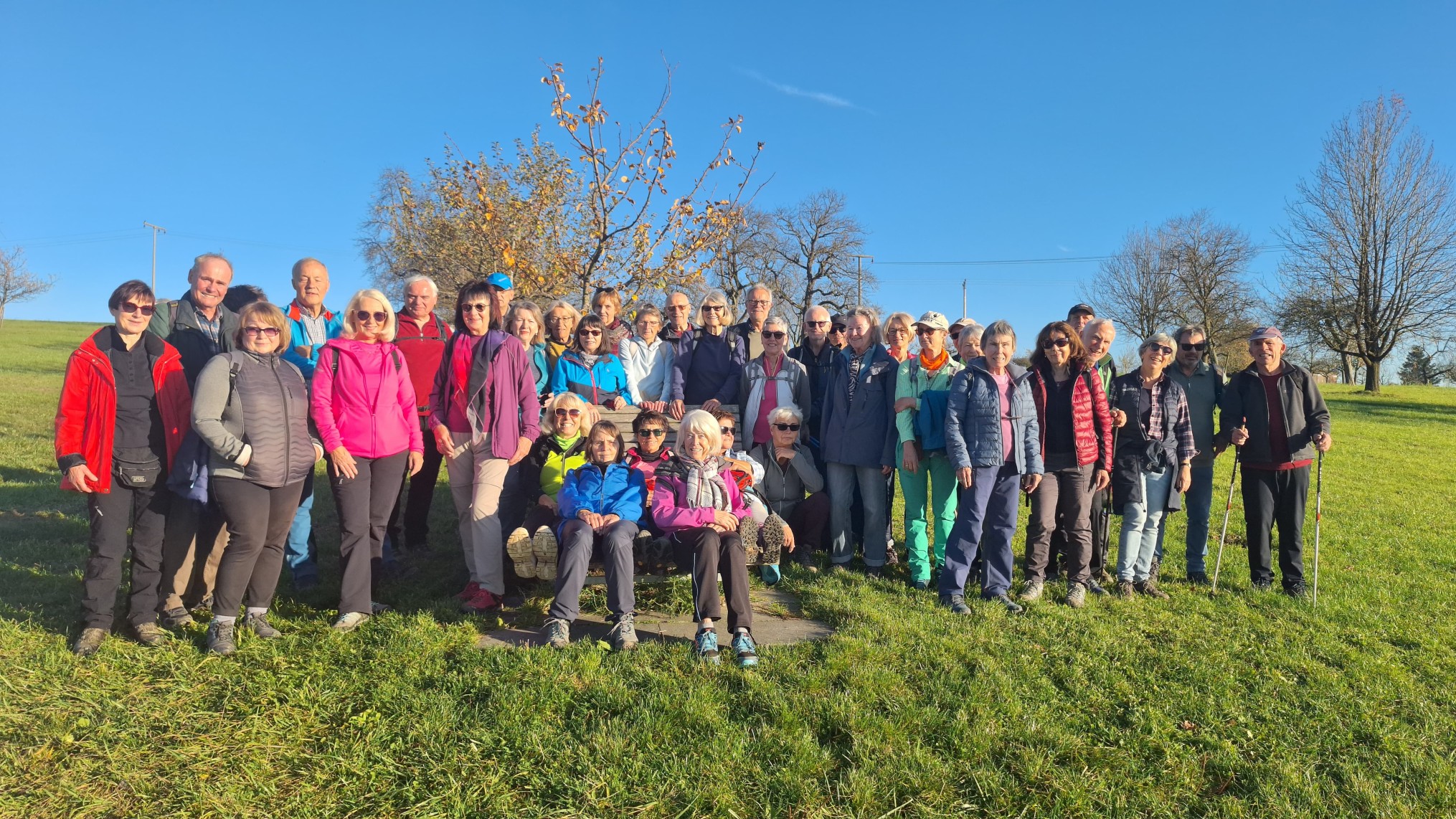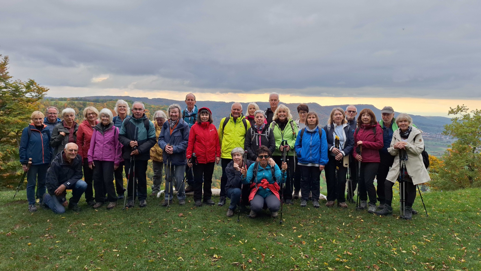 Am 16.10.2025 trafen sich 27 Wanderfreunde zu einer 10 km langen Rundwanderung. Gestartet wurde auf einem Wanderparkplatz unmittelbar nach der Neidlinger Steige. Zunächst ging es an drei Aussiedlerhöfen vorbei bis zur Kreuzkapelle mit schönem Blick über das obere Filstal und zur neuen Eisenbahnbrücke. Durch den bunt gefärbten Wald ging es nun bergab bis ins Schönbachtal, vorbei am Skilift Bläsiberg mit kleiner Skisprungschanze und nun wieder bergauf bis zur Startrampe der Drachenflieger. Dort konnte nochmals die herrliche Aussicht und der bunte Wald genossen werden.