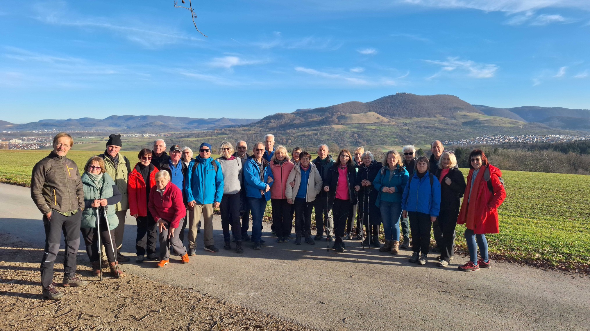 Am 30.1.2025 trafen sich 30 Wanderfreunde bei herrlichem Wanderwetter zu einer 8 km langen Rundwanderung, die am Wanderparkplatz „Bölle“ unterhalt der Burg Teck begann. Es ging zunächst über den Sattelbogen und am östlichen Teckberg entlang bis zum „Hörnle“ . Hier konnte die herrliche Weitsicht genossen werden, bis es über den „Hohen Bol“, einem vorgelagerten Aussichtsberg, zum Ausgangspunkt der aussichtsreichen Wanderung ging.